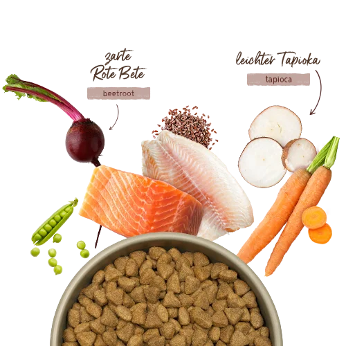 Frisches Tierwohl-Huhn (18 %), frischer Nordsee-Lachs (14 %), frische Tierwohl-Pute (12 %), Erbsenstärke, Erbsen (getrocknet, 10 %), Kartoffelstärke, frische Forelle (9 %), Tapioka (getrocknet, 4 %), Kartoffel (getrocknet, 2,5 %), Erbsenfasern, Proteinhydrolysat, Monocalciumphosphat, Lachsöl, Rote Bete (getrocknet, 0,2 %), Natriumchlorid, Leinsaat (0,2 %), Hagebutten (getrocknet), Karotten (getrocknet, 0,1 %), Federmohn (getrocknet, 0,1 %), Chicorée (getrocknet).