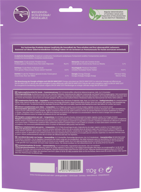 Zusammensetzung: 97,0 % Entenbrustfilet, pflanzliche Nebenerzeugnisse, Hefe, 0,4 % Entenleber