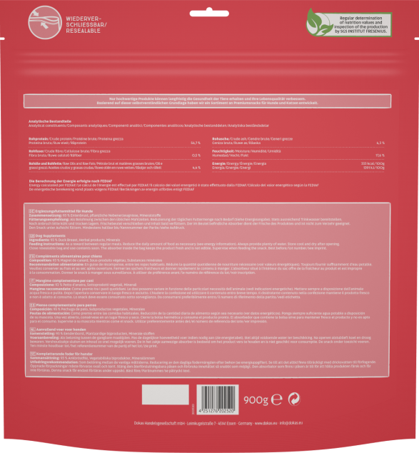 Als Belohnung zwischen den üblichen Mahlzeiten. Max. 10% des täglichen Energiebedarfs zur Verfütterung empfohlen (Siehe Energieangabe). Der Bedarf variiert nach Gewicht, Aktivität und Rasse. Entsprechend die tägliche Hauptfuttermenge reduzieren und stets ausreichend Trinkwasser bereitstellen. Den Snack unter Aufsicht füttern. Der im Beutel befindliche Absorber dient der Frische des Produktes und ist nicht zum Verzehr geeignet. Nach Anbruch kühl und trocken lagern und Inhalt bald verfüttern.