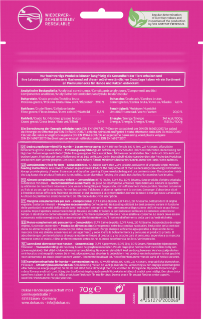Zusammensetzung: 81,7 % Hühnerfleisch, 8,0 % Reis, 2,0 % Sesam, pflanzliche Nebenerzeugnisse, Mineralstoffe