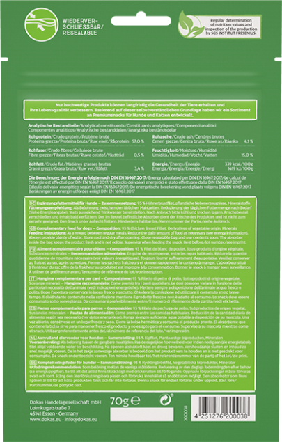 Ideal für unterwegs oder als Belohnung für zwischendurch. Die mundgerechten Häppchen eignen sich auch bestens für Motivationsübungen oder zum Training mit dem Vierbeiner. 100% aus Hühnerbrustfilet (bezogen auf den Fleischanteil).