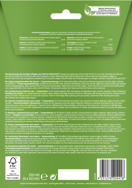 Zusammensetzung: 60 % Hühnerbrustfilet, pflanzliche Nebenerzeugnisse, Kombu-Algen, Sellerie, Heidelbeere