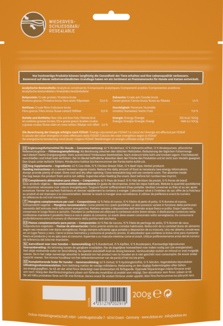 Zusammensetzung: 62 % Rinderhaut, 15 % Hühnerbrustfilet, 12 % Rinderpansen, pflanzliche Nebenerzeugnisse