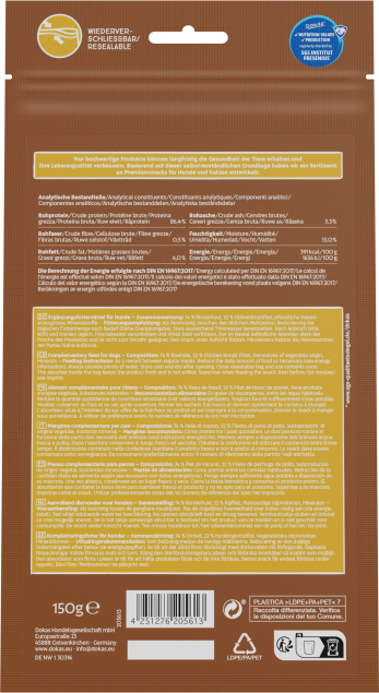Als Belohnung zwischen den üblichen Mahlzeiten. Max. 10% des täglichen Energiebedarfs zur Verfütterung empfohlen (Siehe Energieangabe). Der Bedarf variiert nach Gewicht, Aktivität und Rasse. Entsprechend die tägliche Hauptfuttermenge reduzieren und stets ausreichend Trinkwasser bereitstellen. Den Snack unter Aufsicht füttern. Der im Beutel befindliche Absorber dient der Frische des Produktes und ist nicht zum Verzehr geeignet. Nach Anbruch kühl und trocken lagern und Inhalt bald verfüttern.