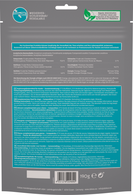 Zusammensetzung: 57 % Rindfleisch, 33 % Rinderhaut, pflanzliche Nebenerzeugnisse, Mineralstoffe
