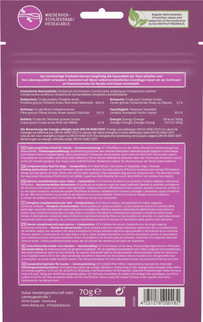 (Siehe Energieangabe). Stets ausreichend Trinkwasser bereitstellen. Nach Anbruch bitte kühl und trocken lagern. Frischebeutel verschließen und Inhalt bald verfüttern. Der im Beutel befindliche Absorber dient der Frische des Produktes und ist nicht zum Verzehr geeignet. Den Snack unter Aufsicht füttern.