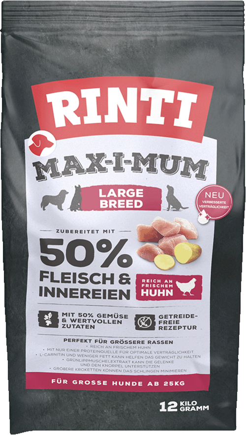 Rinti Maximum Large Breed ist speziell für große Hunde ab 25 kg entwickelt worden. Mit 50% Fleisch und Innereien und ausschließlich Monoprotein Huhn für sensible Großhundmägen. Mehr Ballaststoffe für optimales Gewichtsmanagement und L-Carnitin zur Förderung des Fettstoffwechsels. Das enthaltene Glucosamin (enthalten in Grünlippmuschelextrakt) kann helfen, Knorpel und Gelenke gesund zu erhalten. Natürlich ohne Getreide, ohne Mais, Gluten, Soja, Geschmacksverstärker & künstliche Zusätze. Die größeren Kroketten können helfen, das Schlingen zu reduzieren. Hunde sind von Natur aus Fleischfresser, deshalb verwendet Rinti Max-i-Mum hohe Frischfleischgehalte, die in einem aufwendigen Produktionsprozess verarbeitet werden und kein Getreide.